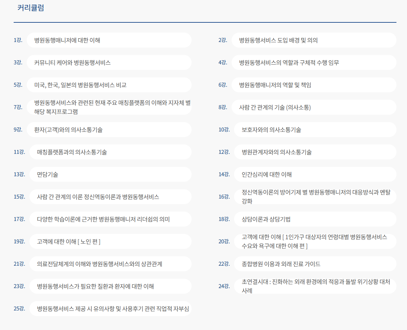 병원 동행 매니저 양성과정에 지원하려면 요양보호사, 사회복지사, 간호사 또는 간호조무사 자격증 중 하나를 소지하고 있어야 합니다. 교육 과정은 병원동행의 이해, 대상자의 이해, 보호자 및 대상자 의사소통, 병원동행 실무 등의 과목으로 구성된 교육 과정을 수료해야 합니다. 교육은 생애경력 설계(6시간)와 이론 및 실습(8시간)으로 구성되며, 노인, 장애인, 환자 등 대상별 사례와 서비스 방법 등 실무 위주로 이루어집니다. 교육 이수자는 구인 업체와 면접을 볼 수 있습니다.