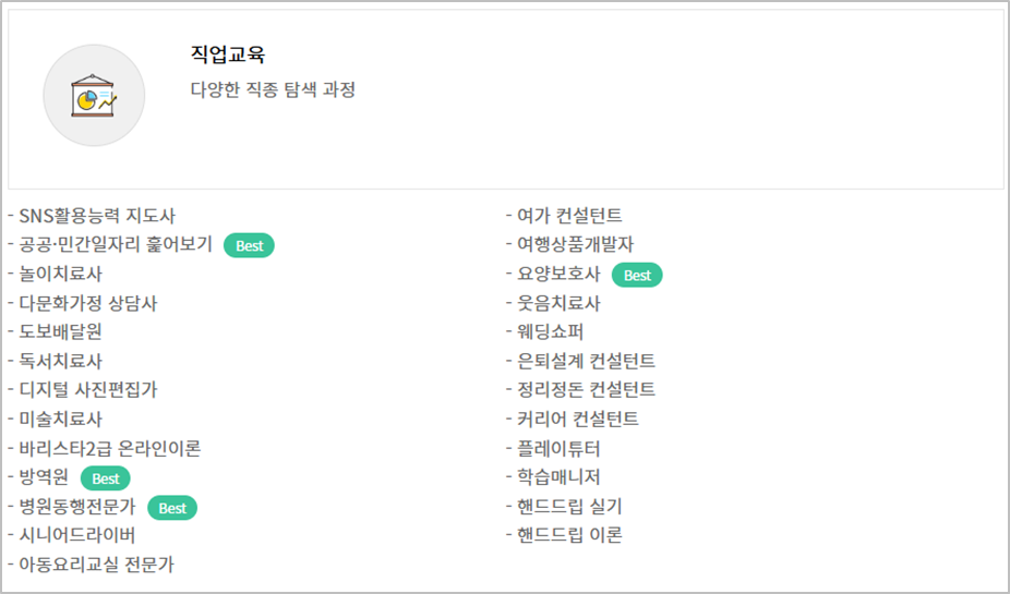 온라인으로도 수강이 가능한 프로그램이 아주 많이 준비되어 있습니다. 시간 장소 구애 없이 온라인으로 취업역량 향상을 지원하고 있습니다. 온라인 취업교육 포털에서 지금 바로 교육비용없이 수강가능한 교육영상을 찾아보세요.