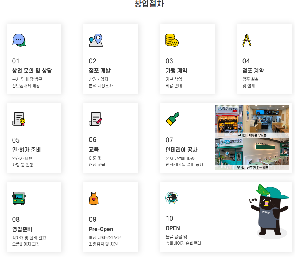 2. 총 12일의 교육과정을 함께하는 오픈바이저와 직원채용 컨설팅과 꾸준한 매장지원의 수퍼바이저
