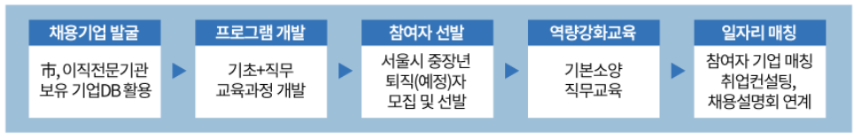 - 협력 기관: 서울시, 50플러스재단, 서울상공회의소(인적자원개발위원회), 경제단체, 서울연구원 등